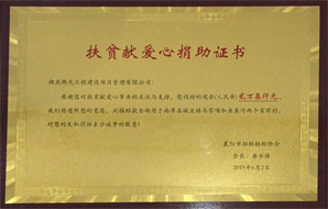 2019年6月2日下午,公司参与襄阳市招标投标协会联合襄阳市公共资源交易监督管理局开展襄阳市招标投标协会扶贫动员大会暨献爱心捐助仪式,襄阳市招标投标协会颁发“扶贫献爱心捐助证书”,2019年度扶贫献爱心“先进单位”证书。