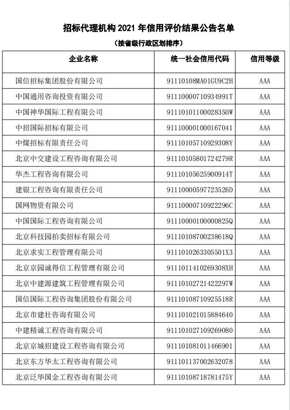 2021年12月8日,中国招标投标协会发布“招标代理机构2021年信用评价结果公告名单”,我公司获得招标代理机构信用评价AAA等级殊荣。